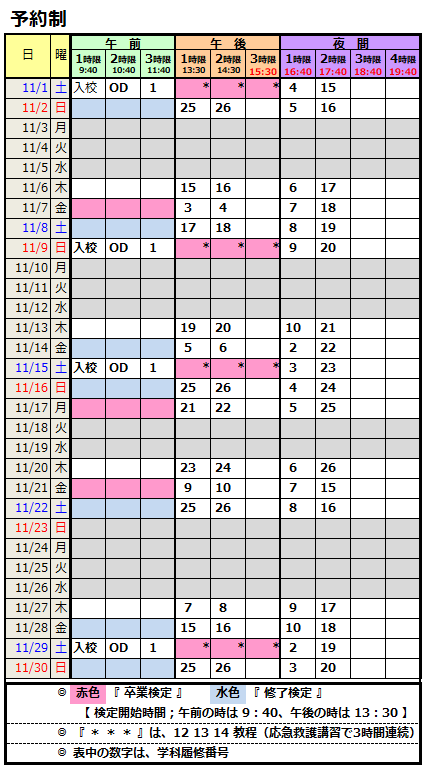 教習日 土曜・日曜も教習と検定を実施しています。 (休校日:火曜・水曜、祝日、年末年始等) 教習時間 午前 午後 夜間 1時限目 9:40~10:30 13:30~14:20 16:40~17:30 2時限目 10:40~11:30 14:30~15:20 17:40~18:30 3時限目 11:40~12:30 15:30~16:20 18:40~19:30 4時限目 – 19:40~20:30 ※技能(実技)は、予約制です。担当指導員と相談して予約して下さい。1日の教習時間の限度(第1段階:2時限まで、第2段階:3時限まで) ※2024.1.5~オンライン学科開始。24時間受講可能です。 ※高速道路での教習は、実車で行います。 学科教習計画(2025.10.3更新) 10月 11月